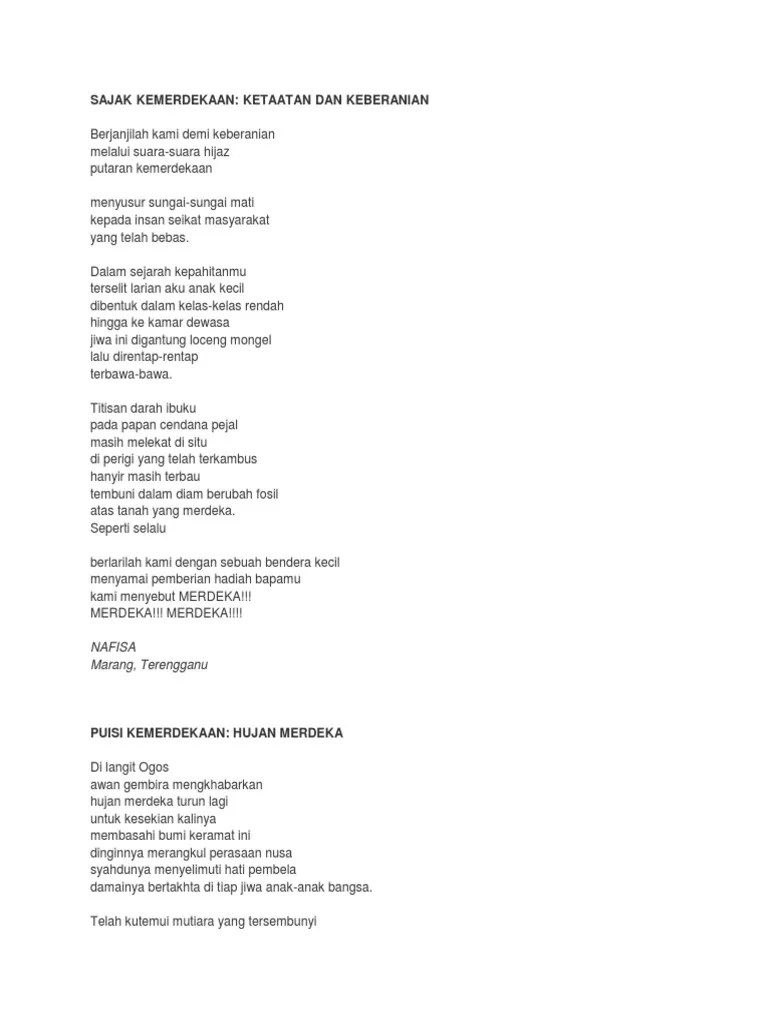 Sajak Kemerdekaan Sehati Sejiwa - 'kayuhan sehati sejiwa' semai semangat cintakan negara melalui kayuhan basikal.. Page ini bertujuan mengajakl seramai mungkin menghayati dan menghargai kemerdekaan sebuah negara. Kita banggakan, tetapi kita tidak tahu. Sehati sejiwa… janganlah kita robohkan kota kemerdekaan yang dibina selama ini… bersatu hatilah memacu perpaduan ekonomi negara kita… sehati sejiwa… akhirnya aku mengalah… inilah negara kita, tidak mampu bertahan lagi…. Sajak sehati sejiwa aliza alexander academia edu. Maksud sebenar apa itu kemerdekaan.