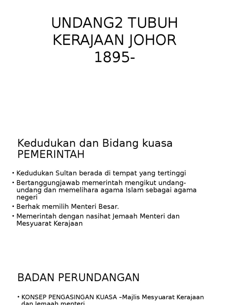 Sejarah Tingkatan 3 Bab 8 æ"ä½çæ¤å½æ³å¾ Undang Undang Tubuh Kerajaan Johor Youtube from i.ytimg.com Ahli lembaga pengampunan negeri johor. Di samping itu, karya ini turut menghuraikan sumber yang digunakan dalam penggubalan naskhah. The key factors of their protest were because all sultans of malay states would lose their power as the ruler of their respectable states, and the way sir harold. Buka m/s 65 modul, dan highlight seperti yang cikgu terangkan dan selesaikan latihan di sebelah. Dalam proses reformasi dewasa ini, terdapat berbagai pendapat dan kajian untuk mengamandemen uud1945, karena uud 1945 harus bersifat fleksibel, yaitu mampu menyesuaikan diri dengan perkembangan. Pindaan pertama pada 1 april 1908. This matter is unanimously agreed upon by all historians and previous studies. There were other boats as well.1 in 1893, the sovereign state of johor.