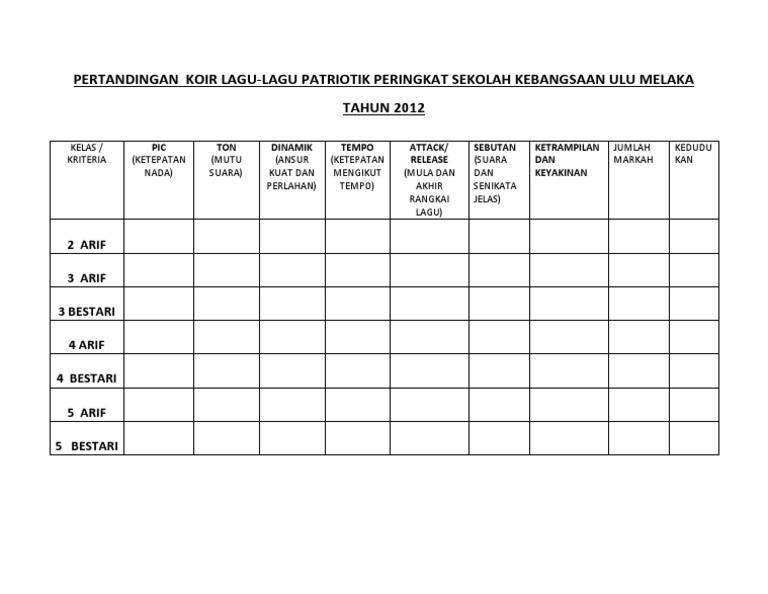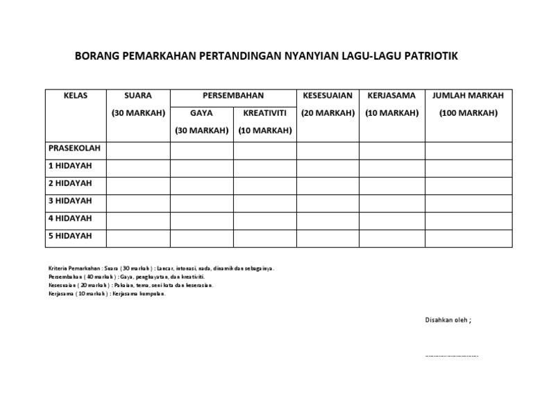 Related : Borang Pemarkahan Pertandingan Nyanyian : Borang Markah An Nyanyian Patriotik - Borang penghakiman pertandingan nyanyian berkumpulan peserta keseragaman (25%) nada (25%) kreativiti (25%) lirik (25%) 1 pintar 2 aktif 3..